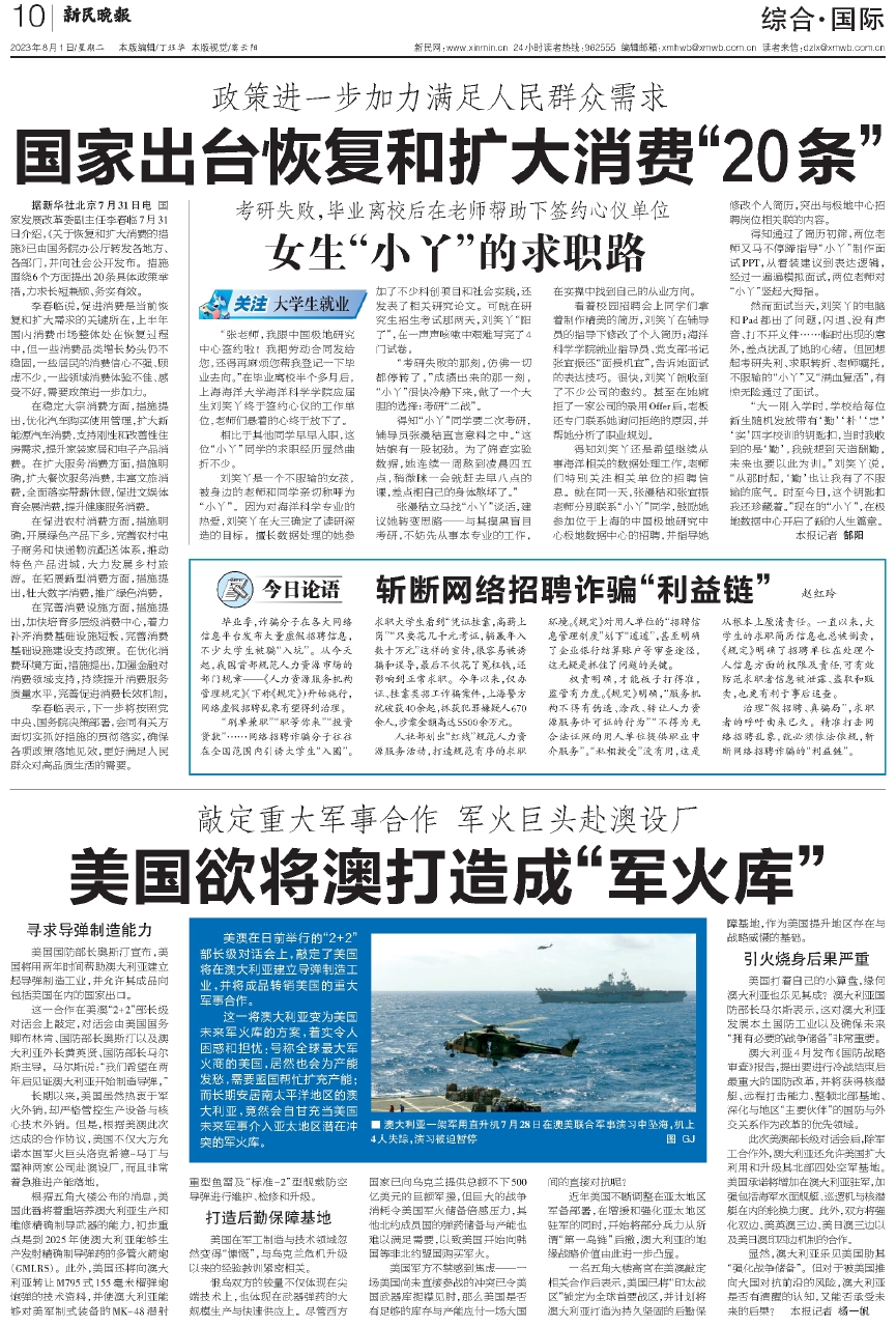 据新华社北京7月31日电 国家发展改革委副主任李春临7月31日介绍,《关于恢复和扩大消费的措施》已由国务院办公厅转发各地方、各部门,并向社会公开发布。措施围绕6个方面提出20条具体政策举措,力求长短兼顾、务实有效。