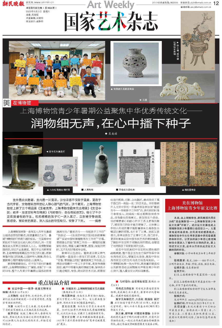 上海博物馆官微一条有关八月学生暑期公益活动预告的推送,阅读量高达7.6万。暑期“博物馆热”持续升温的背后,一方面是学校家长对于传统文化润人润心的共识,另一方面是社会大美育正日渐深入人心。而博物馆能提供的,早已不止是展览。致力于公共教育探索,上海博物馆把藏品当作自己的心脏,将教育看作自己的灵魂,以各种导入情境、符合儿童教育心理的课程与活动,以美育人。