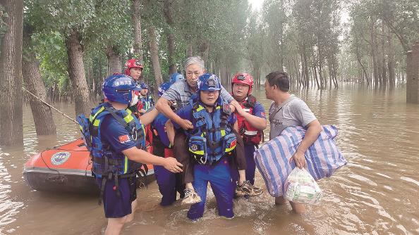 在河北省涿州市汛情重灾区码头镇沙窝村,贵州蓝天救援队队员在转移受困村民(8月4日摄)新华社 发