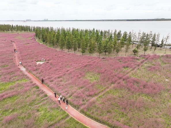 正值粉黛乱子草进入最佳观赏期,连日来,江苏南通市海门区东布洲长滩公园的游客络绎不绝,连片的粉黛花穗随风摇曳,美不胜收,犹如“粉色海洋”。 东布洲长滩公园临长江而建,长约5.5公里,种植了3万平方米粉黛乱子草、1.8万棵水杉树,成为长江大保护海门段的亮点。 许丛军 摄影报道