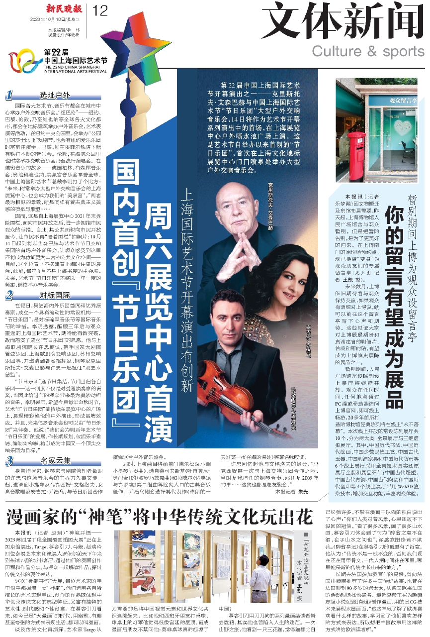 第22届中国上海国际艺术节开幕演出之一——克里斯托夫·艾森巴赫与中国上海国际艺术节“节日乐团”大型户外交响音乐会,14日将作为艺术节开幕系列演出中的首场,在上海展览中心户外喷水池广场上演。这是艺术节自举办以来首创的“节日乐团”,首次在上海文化地标展览中心门口喷泉处举办大型户外交响音乐会。