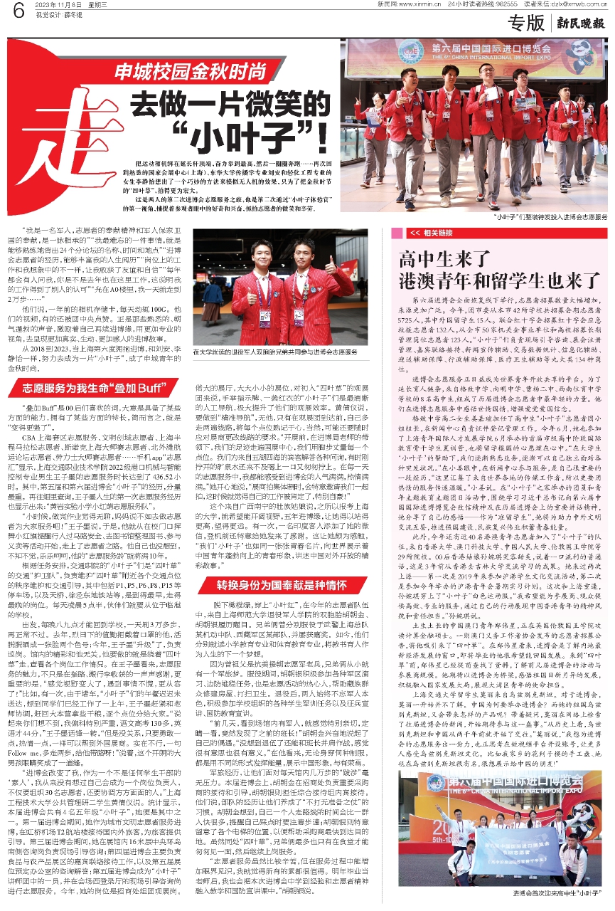 出发,每晚八九点才能回到学校,一天刷3万多步,再正常不过。去年,烈日下的值勤把戴着口罩的他,活脱脱晒成一张脸两个色号;今年,王子墨“升级”了,负责巡岗。馆内的精彩和他无关,他要做的就是绕着“四叶草”走,查看各个岗位工作情况。在王子墨看来,志愿服务的魅力,不只是在指路、搬行李收获的一声声感谢,更重要的是,“感觉视野变大了,遇到事情不慌,更从容了!”比如,有一次,由于堵车,“小叶子”们的午餐迟迟未送达,想到同学们已经工作了一上午,王子墨赶紧和老师协调,赶回大本营拿些干粮,逐个点位分给大家。“说起来你们想不到,我偏科特别严重,语文高考130多,英语才44分。”王子墨话锋一转,“但是没关系,只要勇敢一点,热情一点,一样可以帮到外国展商。实在不行,一句Follow me,多走两步,给他带路呀!”说着,这个开朗的大男孩眼睛笑成了一道缝。