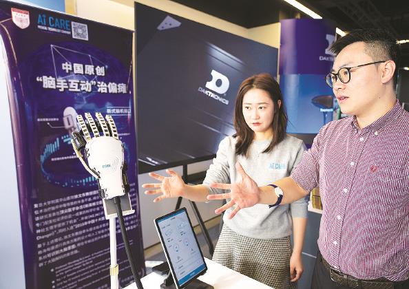 今天,2023第四届上海未来岛家门口工业博览会在普陀区桃浦镇未来岛智谷S06举办。活动紧扣“和合共生 聚智赋能”主题,围绕“讲座论坛、展览展示、应用体验、合作签约”四大板块的核心内容,打造了“线上+线下”虚实共生的“沉浸式”观展体验。 图为帮助偏瘫患者脑手互动的设备 本报记者 张龙 解敏摄影报道