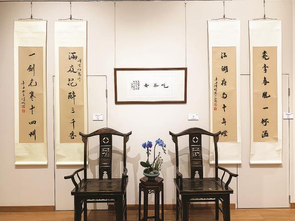 时近春节,展厅里的布置流露出喜庆之意,展览的一大亮点,当属邓伟雄以中国香港上世纪七八十年代电视剧主题曲歌词所作的成扇。他以早年所填的《铁血丹心》《笑傲江湖》《楚留香》等歌词配以墨画创作,既展现凛然的江湖侠义,也表现出自在的文人气节。