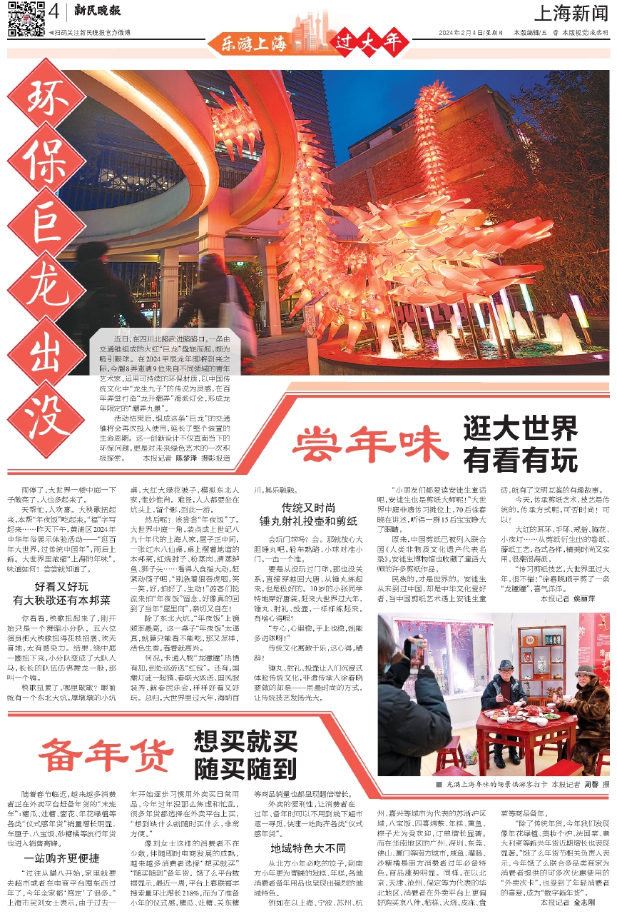 近日,在四川北路武进路路口,一条由交通锥组成的火红“巨龙”盘旋而起,颇为吸引眼球。在2024甲辰龙年即将到来之际,今潮8弄邀请9位来自不同领域的青年艺术家,运用可持续的环保材质,以中国传统文化中“龙生九子”的传说为灵感,在百年弄堂打造“龙升潮弄”海派灯会,形成龙年限定的“潮弄九景”。 活动结束后,组成这条“巨龙”的交通锥将会再次投入使用,延长了整个装置的生命周期。这一创新设计不仅直面当下的环保问题,更是对未来绿色艺术的一次积极探索。 本报记者 陈梦泽 摄影报道