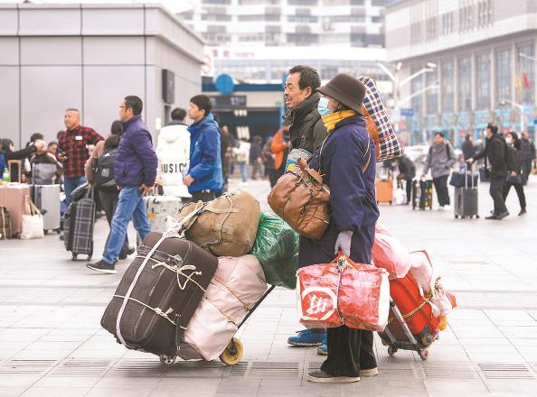 1月29日,上海站南广场,旅客肩扛手提,推着装满大包小包的行李小推车,准备进站上车
