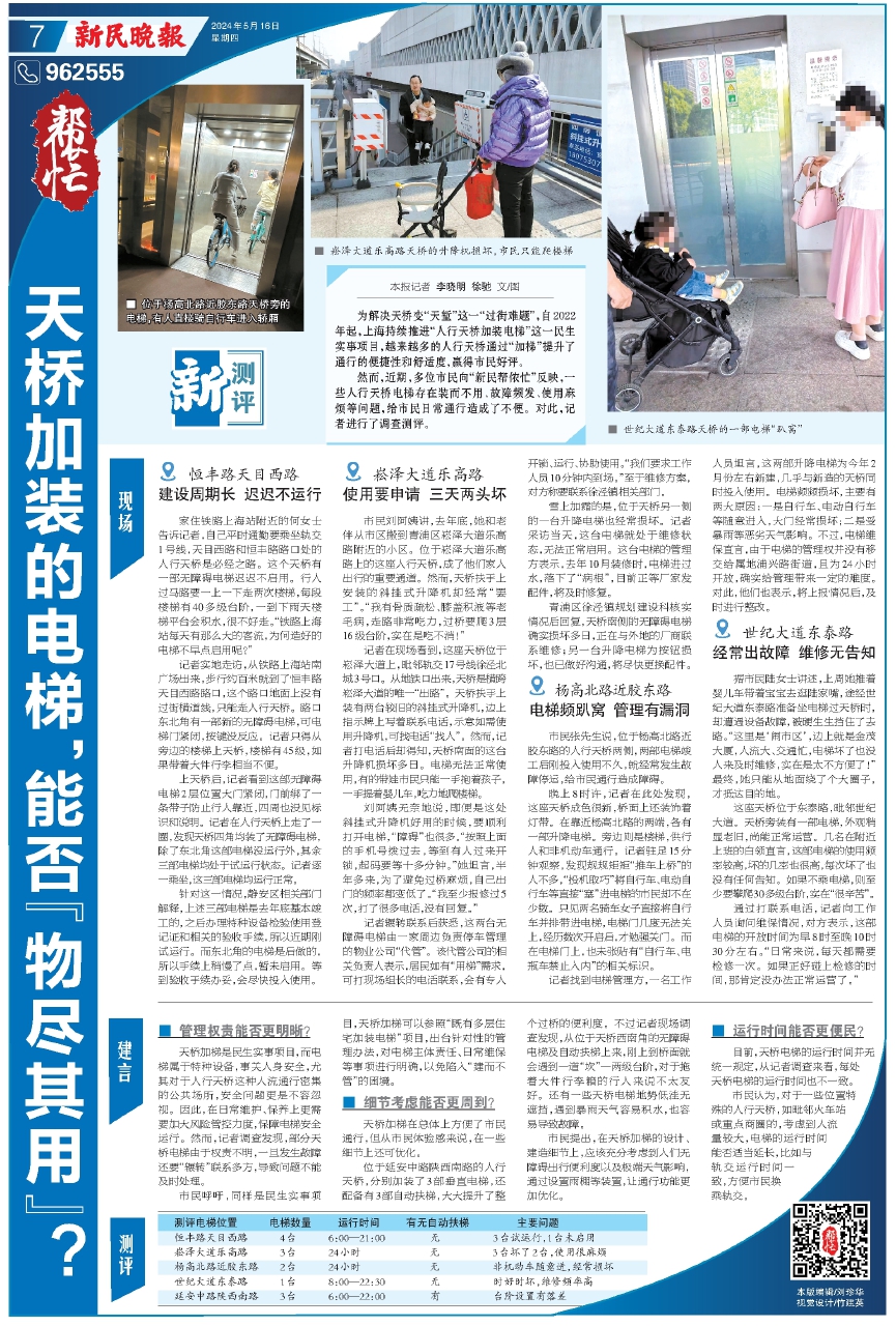 然而,近期,多位市民向“新民帮侬忙”反映,一些人行天桥电梯存在装而不用、故障频发、使用麻烦等问题,给市民日常通行造成了不便。对此,记者进行了调查测评。