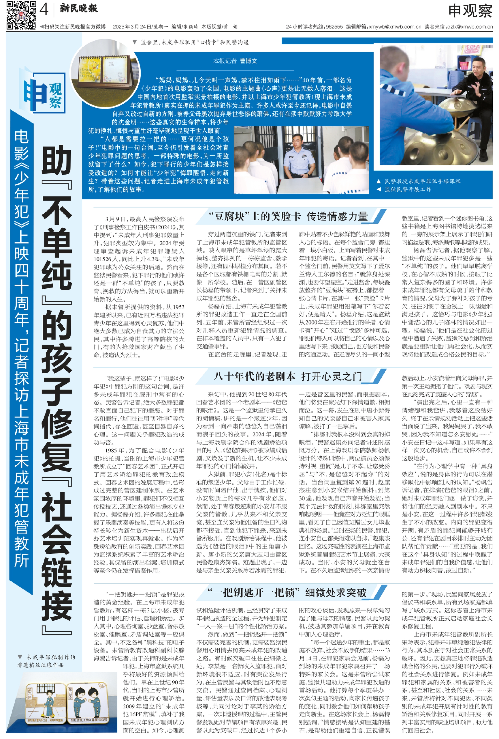 3月9日,最高人民检察院发布了《刑事检察工作白皮书(2024)》,其中提到:“未成年人刑事犯罪数量上升,犯罪类型较为集中。2024年受理审查起诉未成年犯罪嫌疑人101526人,同比上升4.3%。”未成年犯罪成为公众关注的话题。然而在监狱民警看来,犯下罪行的他们或许还是一群“不单纯”的孩子,只要教育、挽救的方法得当,就可以重新开始新的人生。