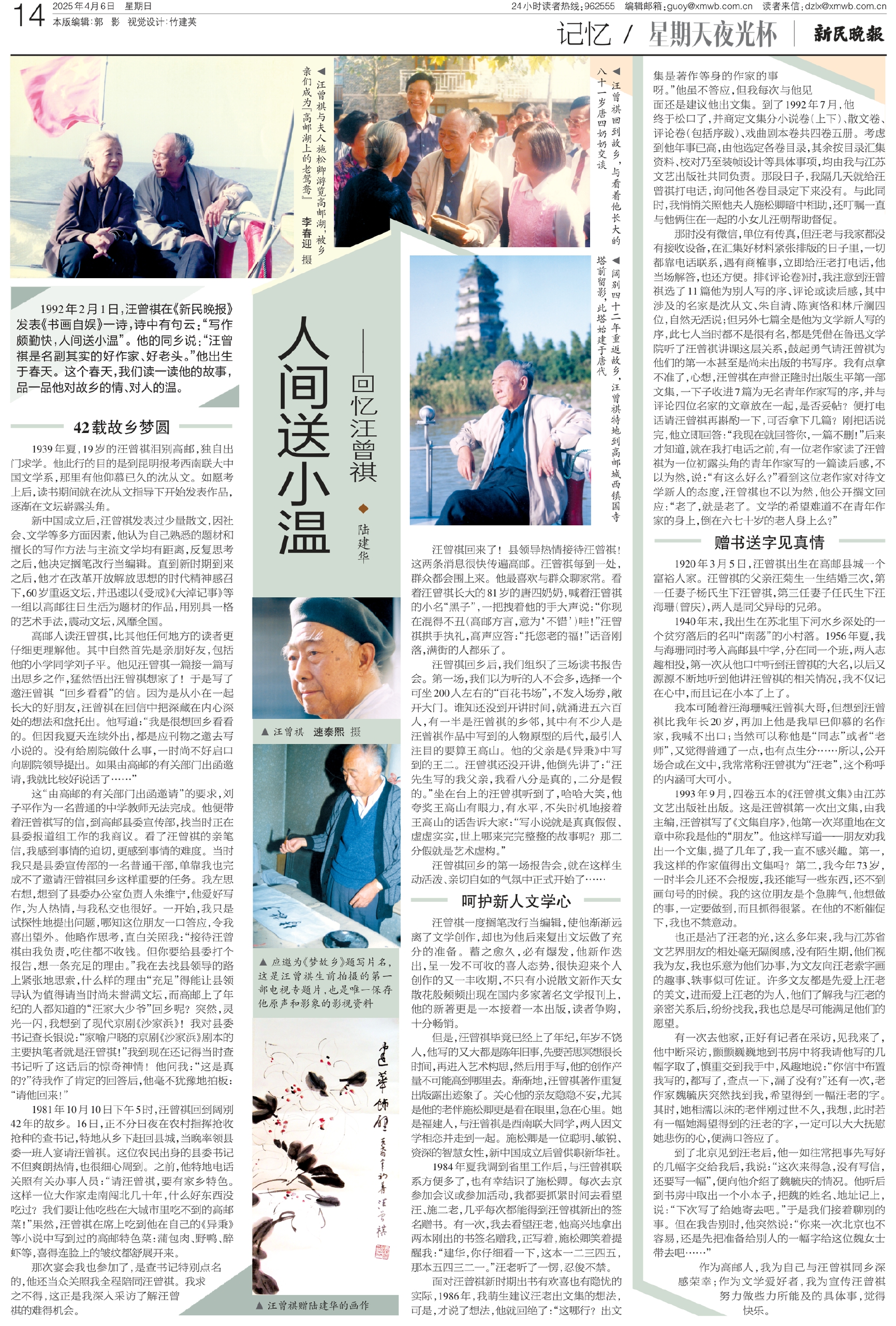 1992年2月1日,汪曾祺在《新民晚报》发表《书画自娱》一诗,诗中有句云:“写作颇勤快,人间送小温”。他的同乡说:“汪曾祺是名副其实的好作家、好老头。”他出生于春天。这个春天,我们读一读他的故事,品一品他对故乡的情、对人的温。
