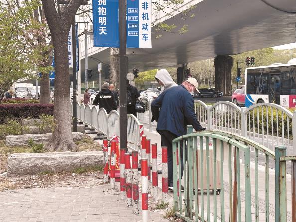 记者在向东前行寻找的过程中,依次经过地铁2号口和7号口。这里人行道与地铁口间的通道均设置了铁栏杆进行隔离,间隙狭小,仅容行人通行,轮椅与婴儿车无法通过。继续前行,看到位于龙阳广场上的无障碍电梯,却发现通往电梯的入口也被栏杆和石墩隔离,“可望而不可及”。记者穿过障碍走到无障碍电梯前,看到贴着“友情提示”:需使用无障碍电梯的乘客请拨打电话联系。“这么大一个交通枢纽,只有三四部无障碍电梯,位置难找,还有重重阻碍。”日常借助轮椅出行的胡老伯直言,龙阳路这里的无障碍设施实在不便,出行深受困扰。