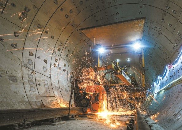今天上午,全线最后一对钢轨接头完成焊接作业,轨道交通18号线二期实现长轨贯通 本报记者 陈梦泽 摄