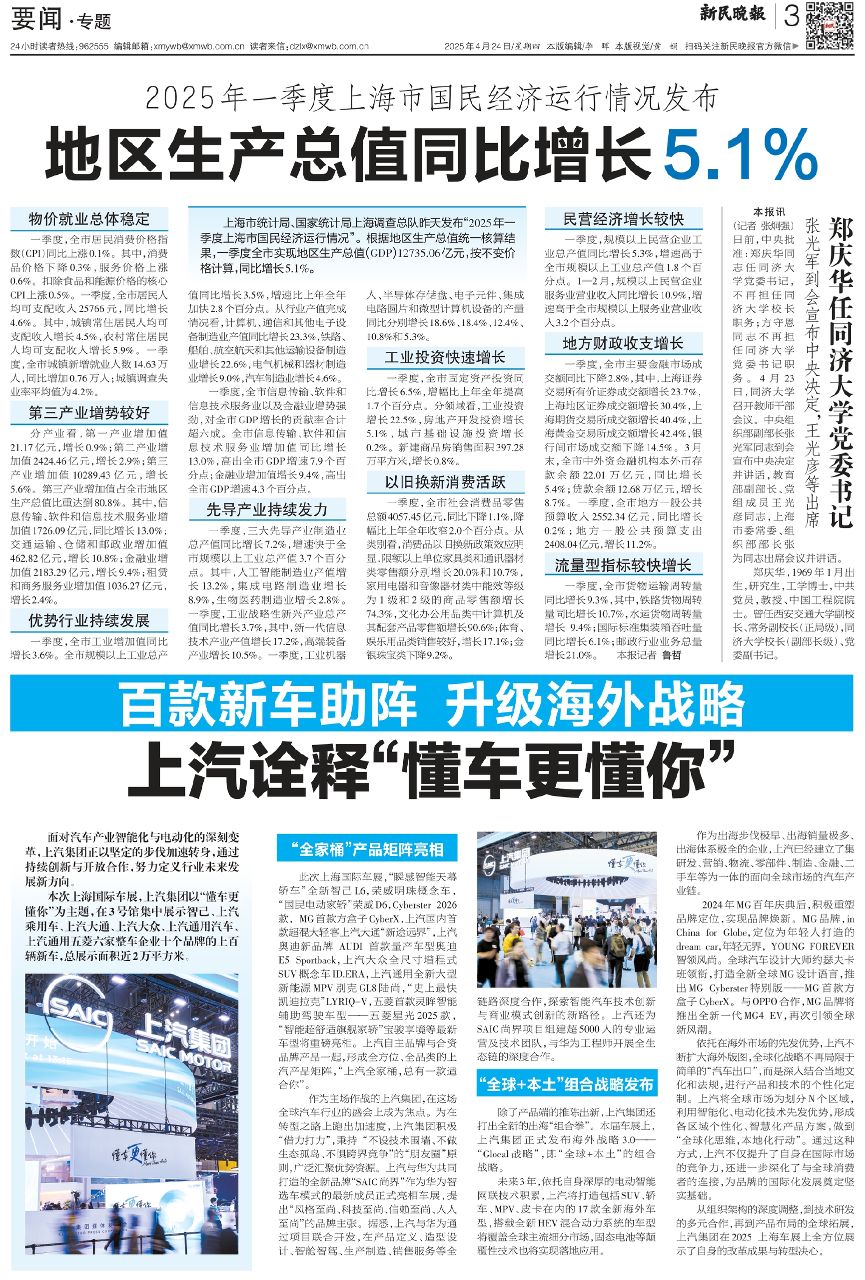 上海市统计局、国家统计局上海调查总队昨天发布“2025年一季度上海市国民经济运行情况”。根据地区生产总值统一核算结果,一季度全市实现地区生产总值(GDP)12735.06亿元,按不变价格计算,同比增长5.1%。