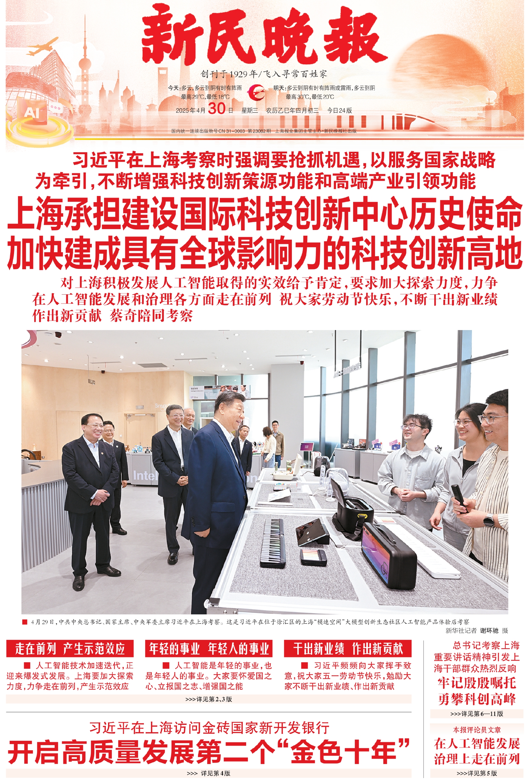 4月29日,中共中央总书记、国家主席、中央军委主席习近平在上海考察。这是习近平在位于徐汇区的上海“模速空间”大模型创新生态社区人工智能产品体验店考察 新华社记者 谢环驰 摄