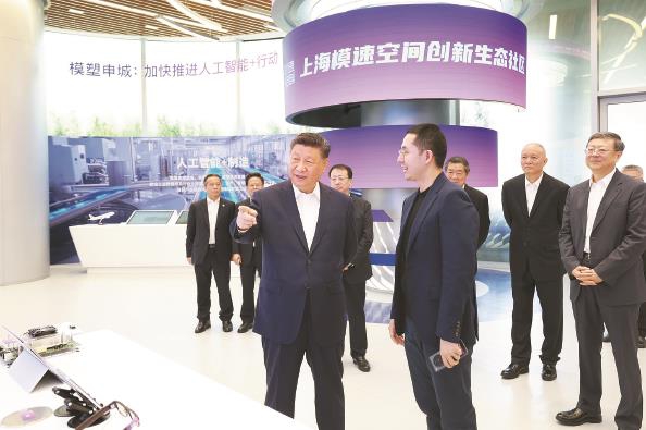 4月29日,中共中央总书记、国家主席、中央军委主席习近平在上海考察。这是习近平在位于徐汇区的上海“模速空间”大模型创新生态社区考察 新华社记者 王晔 摄