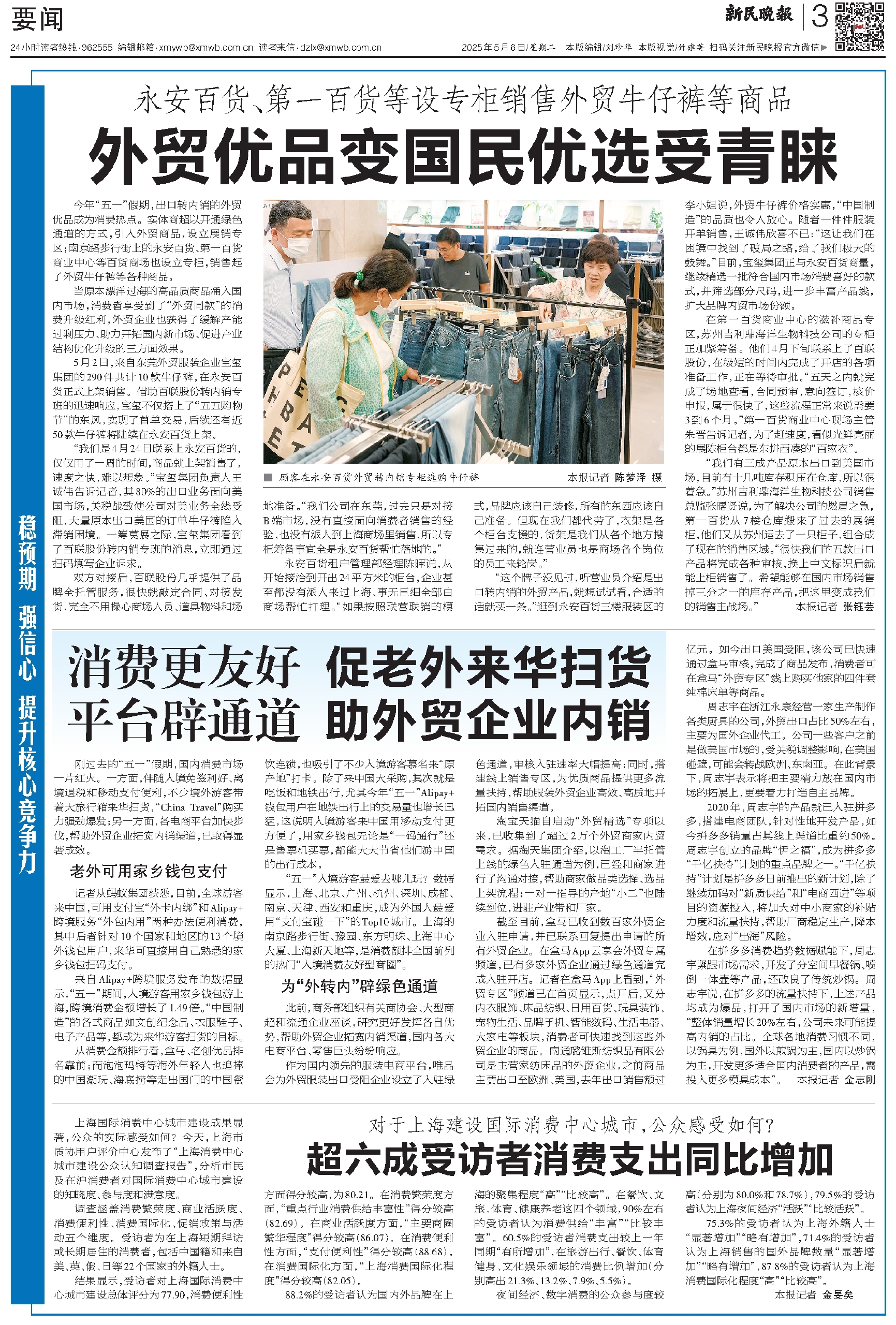 今年“五一”假期,出口转内销的外贸优品成为消费热点。实体商超以开通绿色通道的方式,引入外贸商品,设立展销专区;南京路步行街上的永安百货、第一百货商业中心等百货商场也设立专柜,销售起了外贸牛仔裤等各种商品。