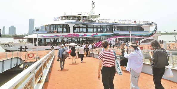 今天上午,黄浦江畔汽笛长鸣,龙华码头正式启用。这个由亚洲最大百年水泥厂码头蜕变而来的滨水空间,以“工业锈带变生活秀带”的惊艳转身,成为上海文旅版图上的新地标。图为游客在新启用的龙华码头依次登船 本报记者 周馨 杨玉红 摄影报道