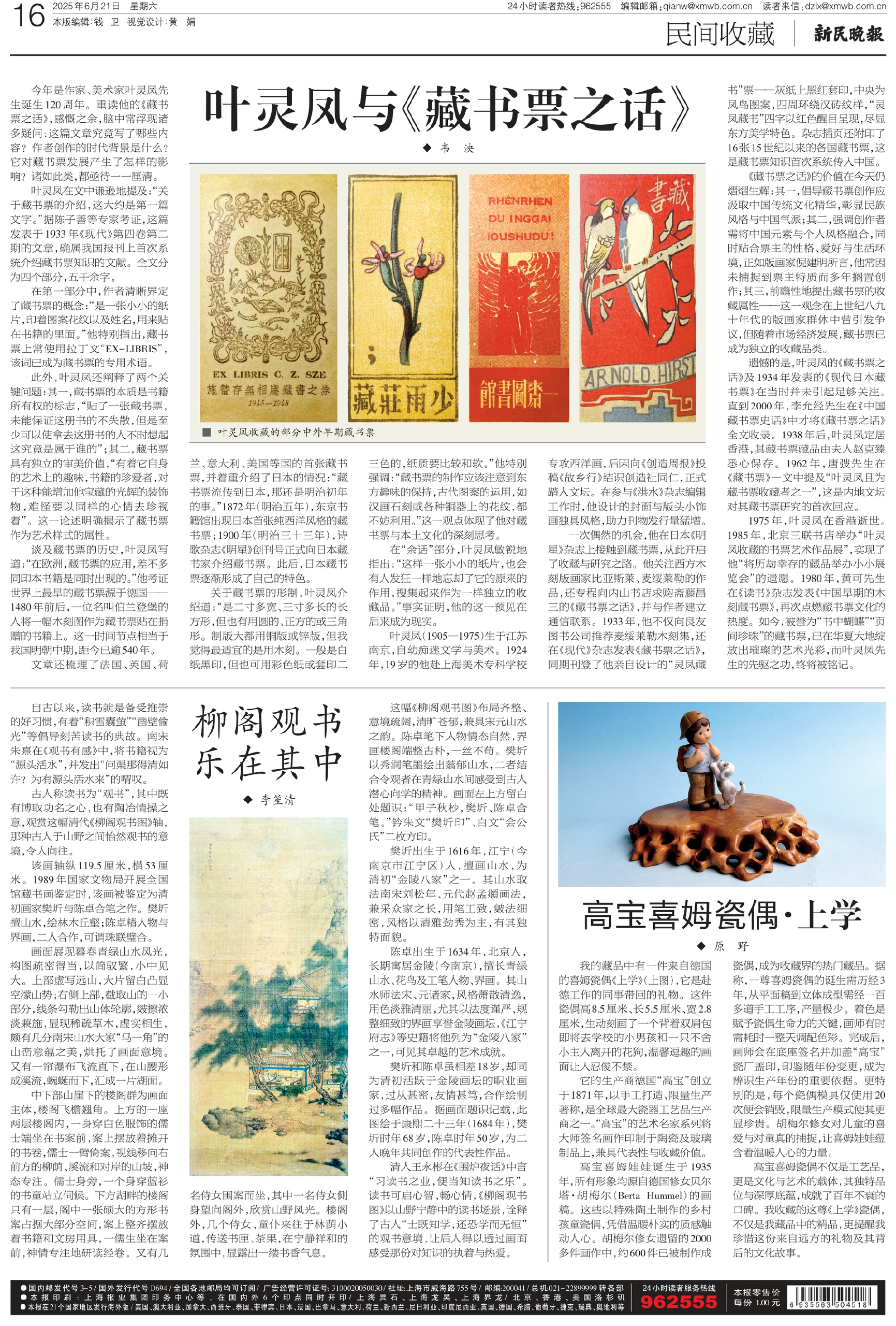 1975年,叶灵凤在香港逝世。1985年,北京三联书店举办“叶灵凤收藏的书票艺术作品展”,实现了他“将历劫幸存的藏品举办小小展览会”的遗愿。1980年,黄可先生在《读书》杂志发表《中国早期的木刻藏书票》,再次点燃藏书票文化的热度。如今,被誉为“书中蝴蝶”“页间珍珠”的藏书票,已在华夏大地绽放出璀璨的艺术光彩,而叶灵凤先生的先驱之功,终将被铭记。