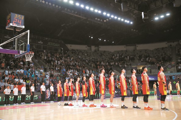 中国男篮球员和教练员在决赛前奏唱国歌仪式上列队 本文图片 新华社 发