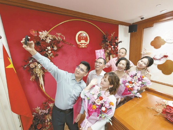 昨天,上海市静安区婚姻登记中心颁证大厅,金婚、银婚与新婚的三对夫妻共同接过“爱在上海”主题纪念婚书,正式拉开2025“爱在上海服务消费‘+’年华”系列活动的序幕。 随着七夕节即将到来,全市16个区婚登中心同步启用“爱在上海”主题装饰,以海派浪漫织就上海市婚恋服务新图景,助力文旅商体展联动。 本报记者 刘歆 摄影报道