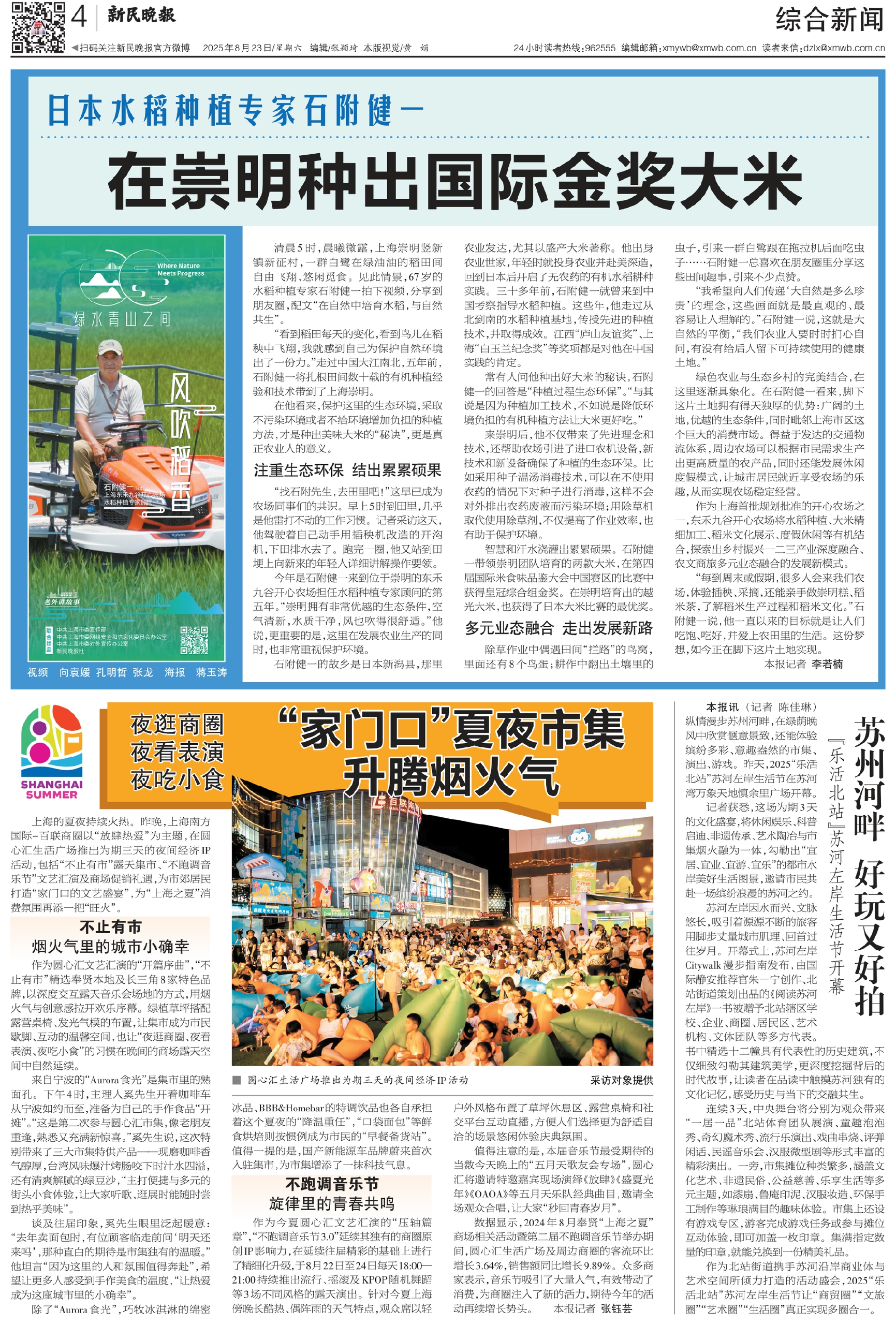 “每到周末或假期,很多人会来我们农场,体验插秧、采摘,还能亲手做崇明糕、稻米茶,了解稻米生产过程和稻米文化。”石附健一说,他一直以来的目标就是让人们吃饱、吃好,并爱上农田里的生活。这份梦想,如今正在脚下这片土地实现。