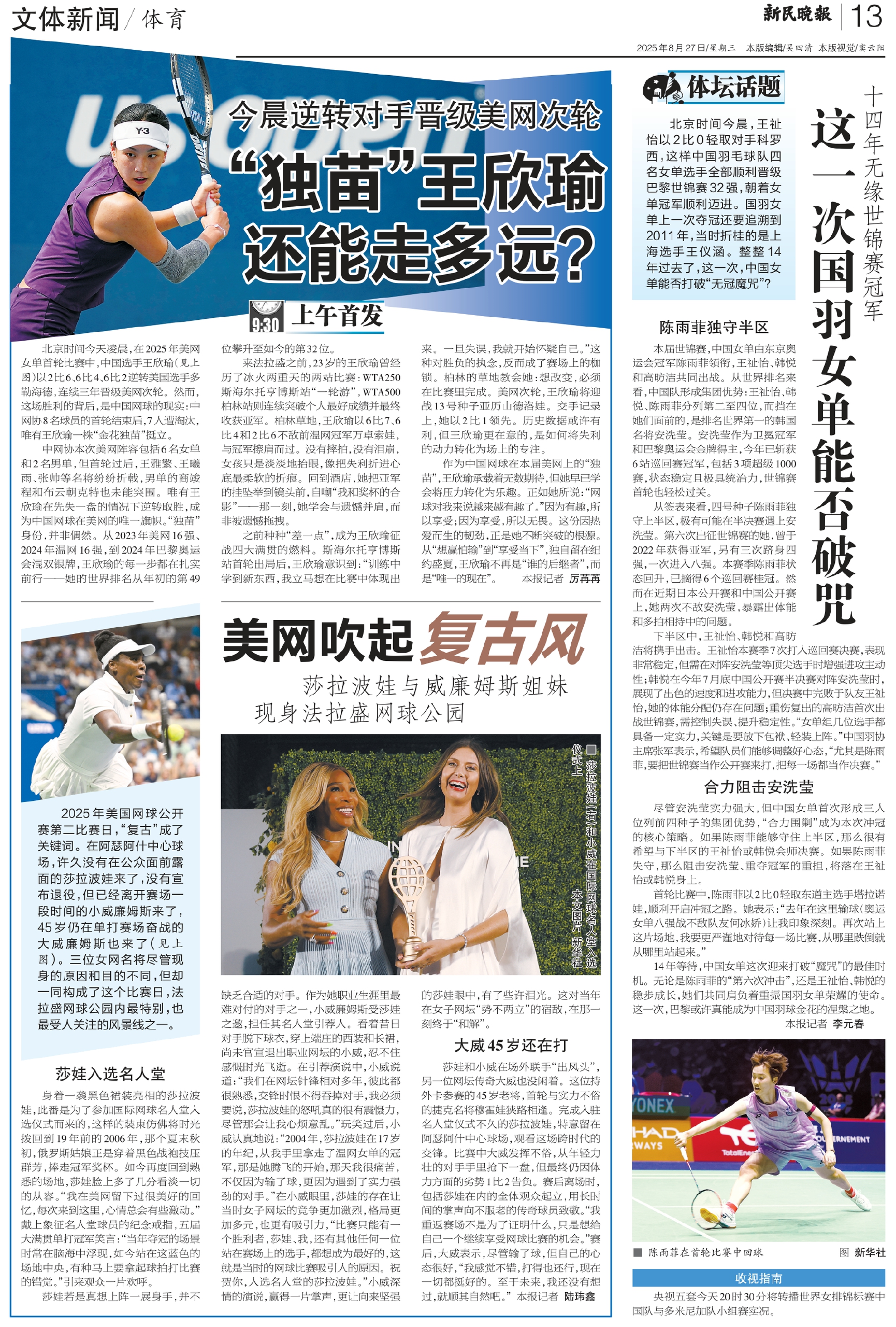 作为中国网球在本届美网上的“独苗”,王欣瑜承载着无数期待,但她早已学会将压力转化为乐趣。正如她所说:“网球对我来说越来越有趣了。”因为有趣,所以享受;因为享受,所以无畏。这份因热爱而生的韧劲,正是她不断突破的根源。从“想赢怕输”到“享受当下”,独自留在纽约盛夏,王欣瑜不再是“谁的后继者”,而是“唯一的现在”。 本报记者 厉苒苒