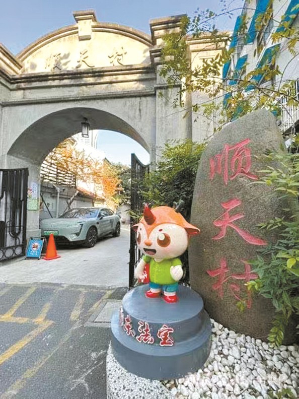 成都北路顺天村大门口,站着一只卡通“法宝”。“法宝”,长着鹿角的独角兽,本名獬豸,象征公平正义,“城市之心”法治文明吉祥物。设计方案,广泛征集居民意愿,居民们投票选择了自己心中的“法宝”,长相卡通、温厚可爱、独家原创接地气。