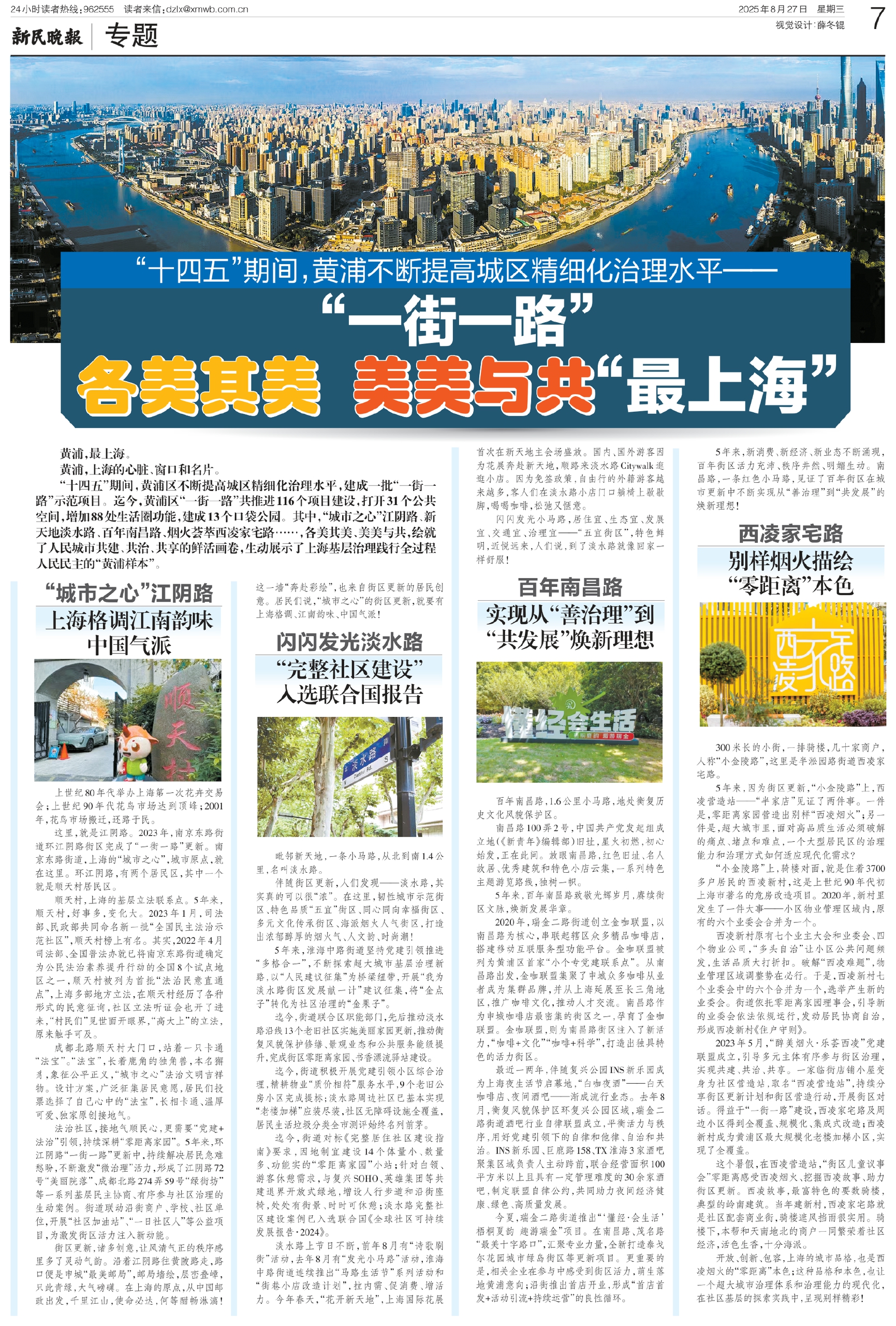 “十四五”期间,黄浦区不断提高城区精细化治理水平,建成一批“一街一路”示范项目。迄今,黄浦区“一街一路”共推进116个项目建设,打开31个公共空间,增加88处生活圈功能,建成13个口袋公园。其中,“城市之心”江阴路、新天地淡水路、百年南昌路、烟火荟萃西凌家宅路……,各美其美、美美与共,绘就了人民城市共建、共治、共享的鲜活画卷,生动展示了上海基层治理践行全过程人民民主的“黄浦样本”。