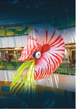 这正是横跨四个扶梯区,视觉纵深达300米的中国先锋视觉艺术家陈天灼的《海语》装置。作品围绕“印迹、浮栖、触发、回响”四个篇章展开,述说了不同的生态叙事,在最摩登的商场营造出一片诗意瀚海。