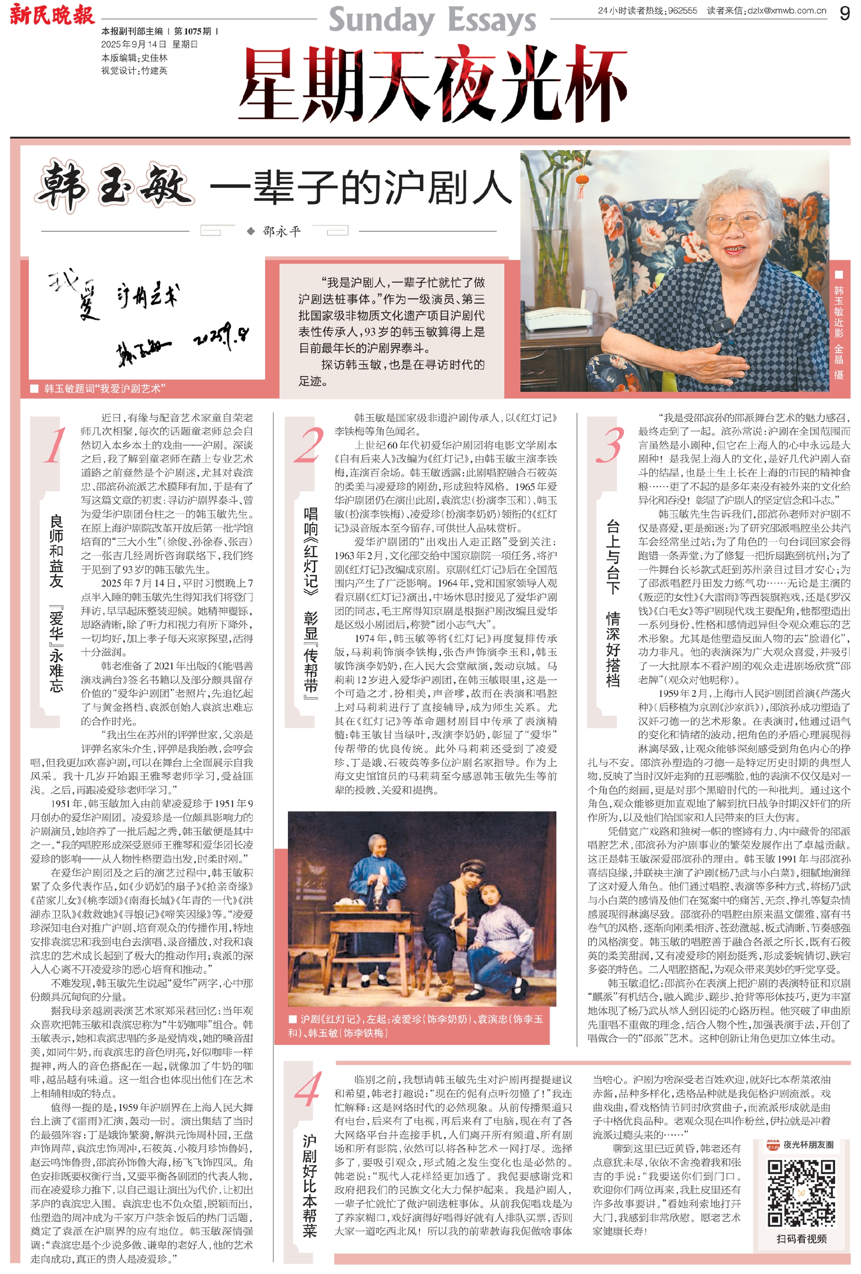 临别之前,我想请韩玉敏先生对沪剧再提提建议和希望,韩老打趣说:“现在的伲有点听勿懂了!”我连忙解释:这是网络时代的必然现象。从前传播渠道只有电台,后来有了电视,再后来有了电脑,现在有了各大网络平台并连接手机,人们离开所有频道、所有剧场和所有影院,依然可以将各种艺术一网打尽。选择多了,要吸引观众,形式随之发生变化也是必然的。韩老说:“现代人花样经更加透了。我伲要感谢党和政府把我们的民族文化大力保护起来。我是沪剧人,一辈子忙就忙了做沪剧迭桩事体。从前我伲唱戏是为了养家糊口,戏好演得好唱得好就有人排队买票,否则大家一道吃西北风!所以我的前辈教诲我伲做啥事体当啥心。沪剧为啥深受老百姓欢迎,就好比本帮菜浓油赤酱,品种多样化,迭格品种就是我伲格沪剧流派。戏曲戏曲,看戏格情节同时欣赏曲子,而流派形成就是曲子中格优良品种。老观众现在叫作粉丝,伊拉就是冲着流派过瘾头来的……”