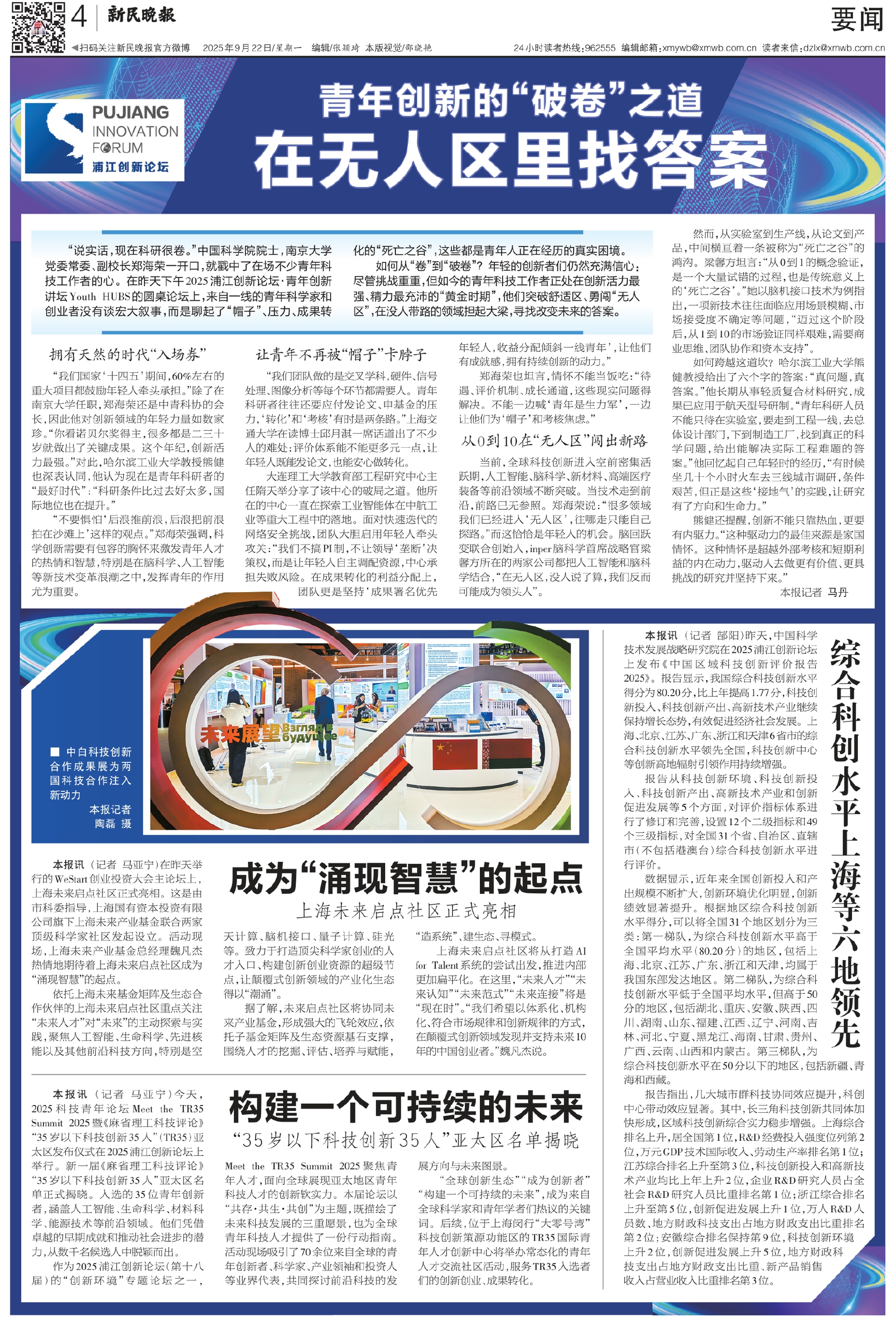 当前,全球科技创新进入空前密集活跃期,人工智能、脑科学、新材料、高端医疗装备等前沿领域不断突破。当技术走到前沿,前路已无参照。郑海荣说:“很多领域我们已经进入‘无人区’,往哪走只能自己探路。”而这恰恰是年轻人的机会。脑回跃变联合创始人,inper脑科学首席战略官梁馨方所在的两家公司都把人工智能和脑科学结合,“在无人区,没人说了算,我们反而可能成为领头人”。