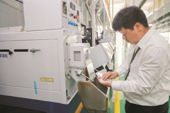 90后陈建宇在智慧稻米加工厂内查看设备试运行情况