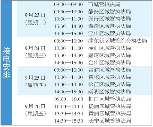 “城管执法局长接热线”期间,您既可以反映在城市治理中遇到的操心事、烦心事、揪心事,也可咨询城管领域的法律法规,更期待您为城市精细化治理能力的提升贡献“金点子”。明天起,阿拉等侬打电话!
