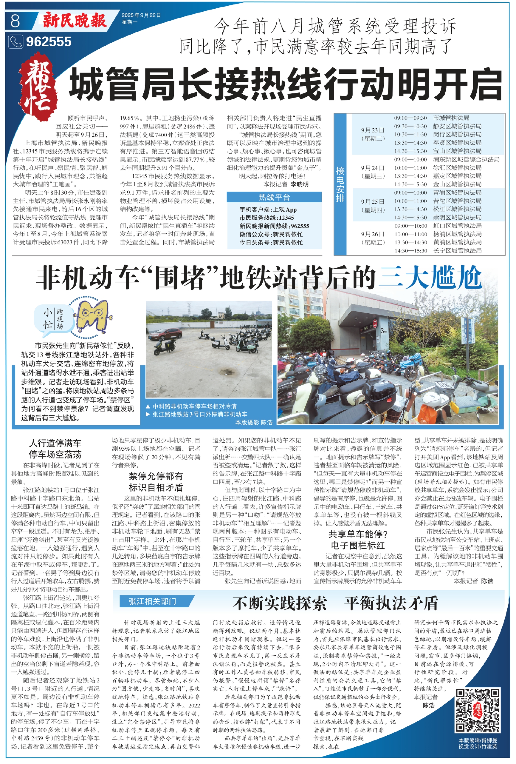 倾听市民呼声、回应社会关切——明天起至9月26日,上海市城管执法局、新民晚报社、12345市民服务热线将携手连续第十年开启“城管执法局长接热线”行动,在听民声、察民情、聚民智、解民忧中,践行人民城市理念,共绘超大城市治理的“工笔画”。