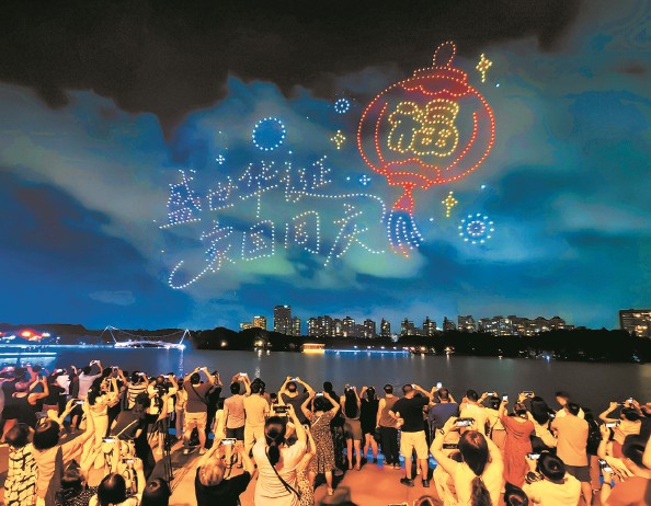 无人机在世纪公园镜天湖上空构成了“盛世华诞 家国同庆”字样图案 杨建正 摄