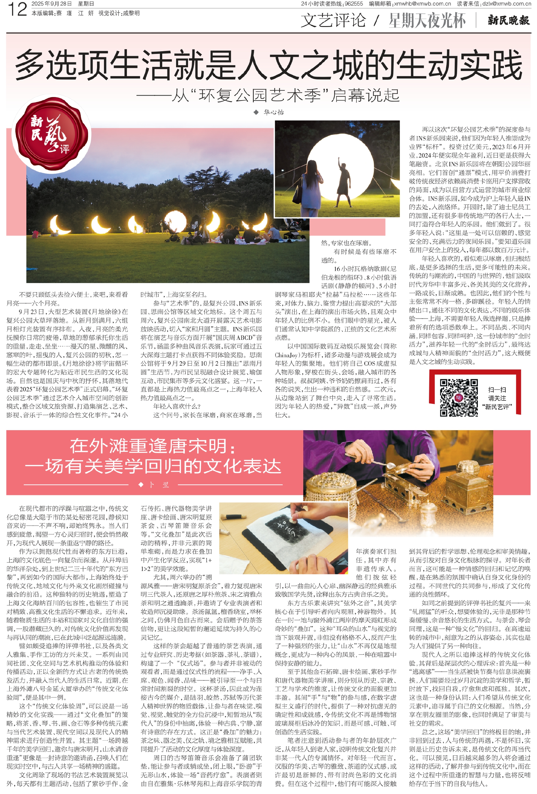 9月23日,大型艺术装置《月地徐徐》在复兴公园大草坪落地。从新月到满月,六组月相灯光装置有序排布。入夜,月亮的柔光抚摸你日常的疲倦,草地的葱郁承托你生活的重量,走走、坐坐……漫天的星、微醺的风、窸窣的叶,摇曳的人,复兴公园的初秋,怎一幅生动的都市即景。《月地徐徐》将宇宙循环的宏大专题转化为贴近市民生活的文化现场。自然也是国庆与中秋的抒怀,其落地代表着2025“环复公园艺术季”正式启幕。“环复公园艺术季”通过艺术介入城市空间的创新模式,整合区域文旅资源、打造集演艺、艺术、影视、音乐于一体的综合性文化事件。“24小时城市”,上海实至名归。