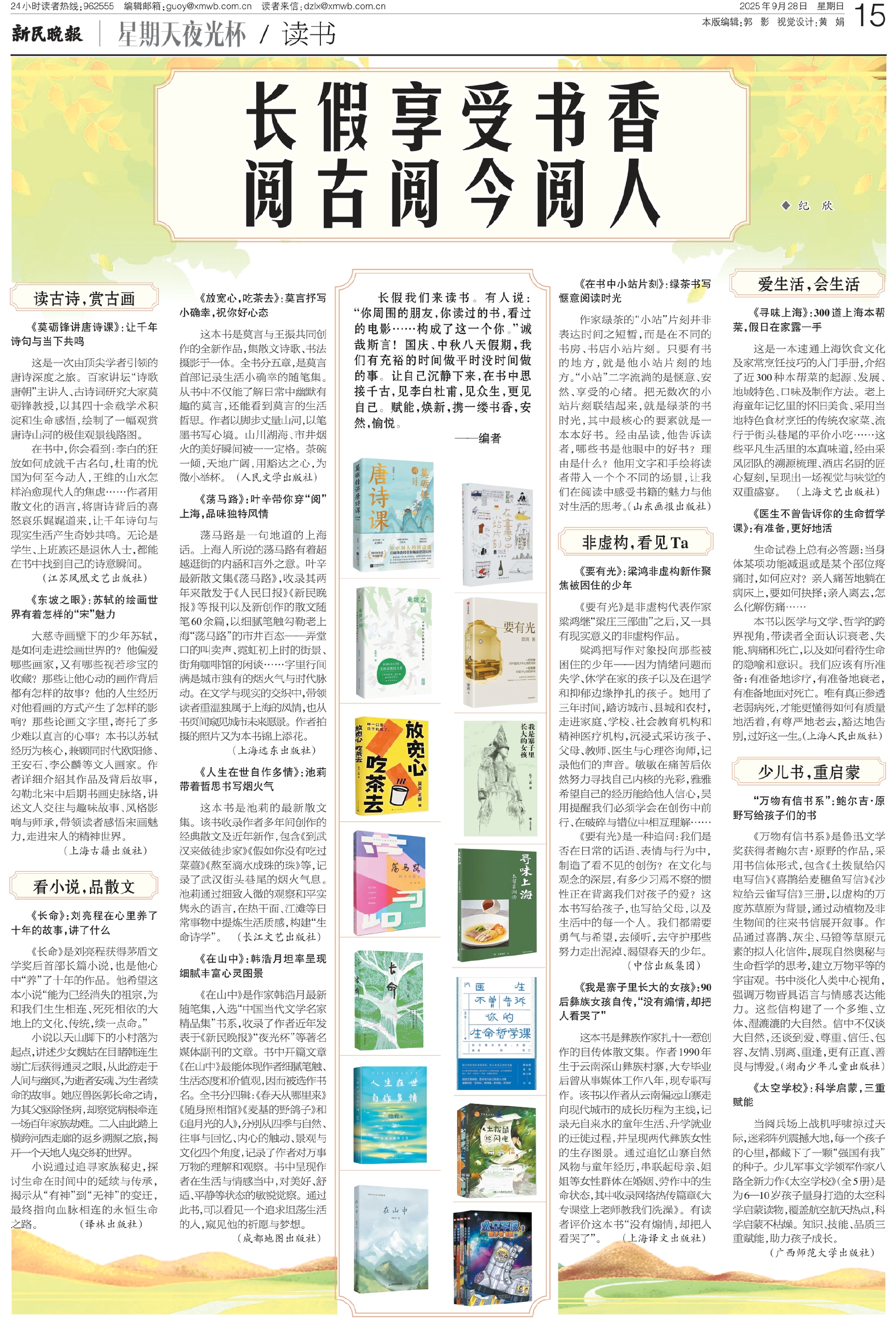 长假我们来读书。有人说:“你周围的朋友,你读过的书,看过的电影……构成了这一个你。”诚哉斯言!国庆、中秋八天假期,我们有充裕的时间做平时没时间做的事。让自己沉静下来,在书中思接千古,见李白杜甫,见众生,更见自己。赋能,焕新,携一缕书香,安然,愉悦。