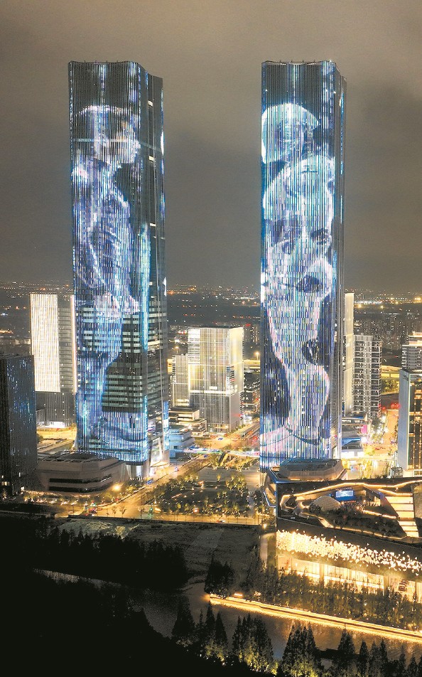 当晚,张江科学之门以双子塔的立面为幕布,上演沉浸式光影秀《星河启明》,以光影与科技的结合,展现浦东创新创造、逐梦未来的精神。