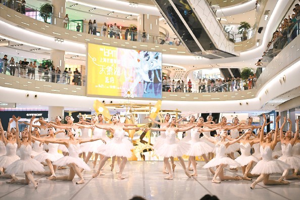 昨天,浦东环贸iapm商场中庭变身舞台,上海芭蕾舞团演员为周末前来休闲购物的市民献上经典版《天鹅湖》特别演出。这是商场为国庆中秋双节推出的系列活动之一 本报记者 刘歆 摄
