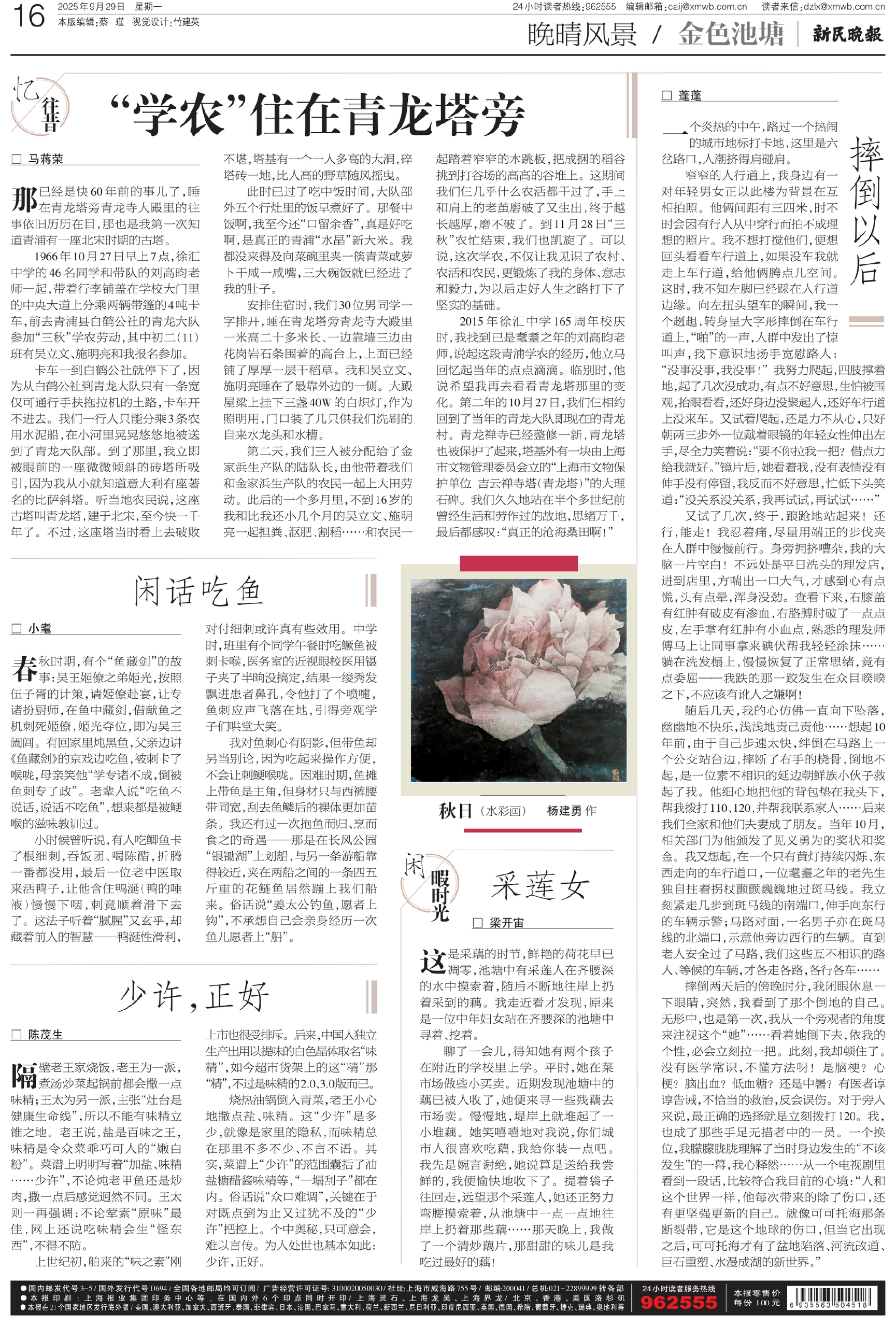 2015年徐汇中学165周年校庆时,我找到已是耄耋之年的刘高昀老师,说起这段青浦学农的经历,他立马回忆起当年的点点滴滴。临别时,他说希望我再去看看青龙塔那里的变化。第二年的10月27日,我们仨相约回到了当年的青龙大队即现在的青龙村。青龙禅寺已经整修一新,青龙塔也被保护了起来,塔基外有一块由上海市文物管理委员会立的“上海市文物保护单位 吉云禅寺塔(青龙塔)”的大理石碑。我们久久地站在半个多世纪前曾经生活和劳作过的故地,思绪万千,最后都感叹:“真正的沧海桑田啊!”