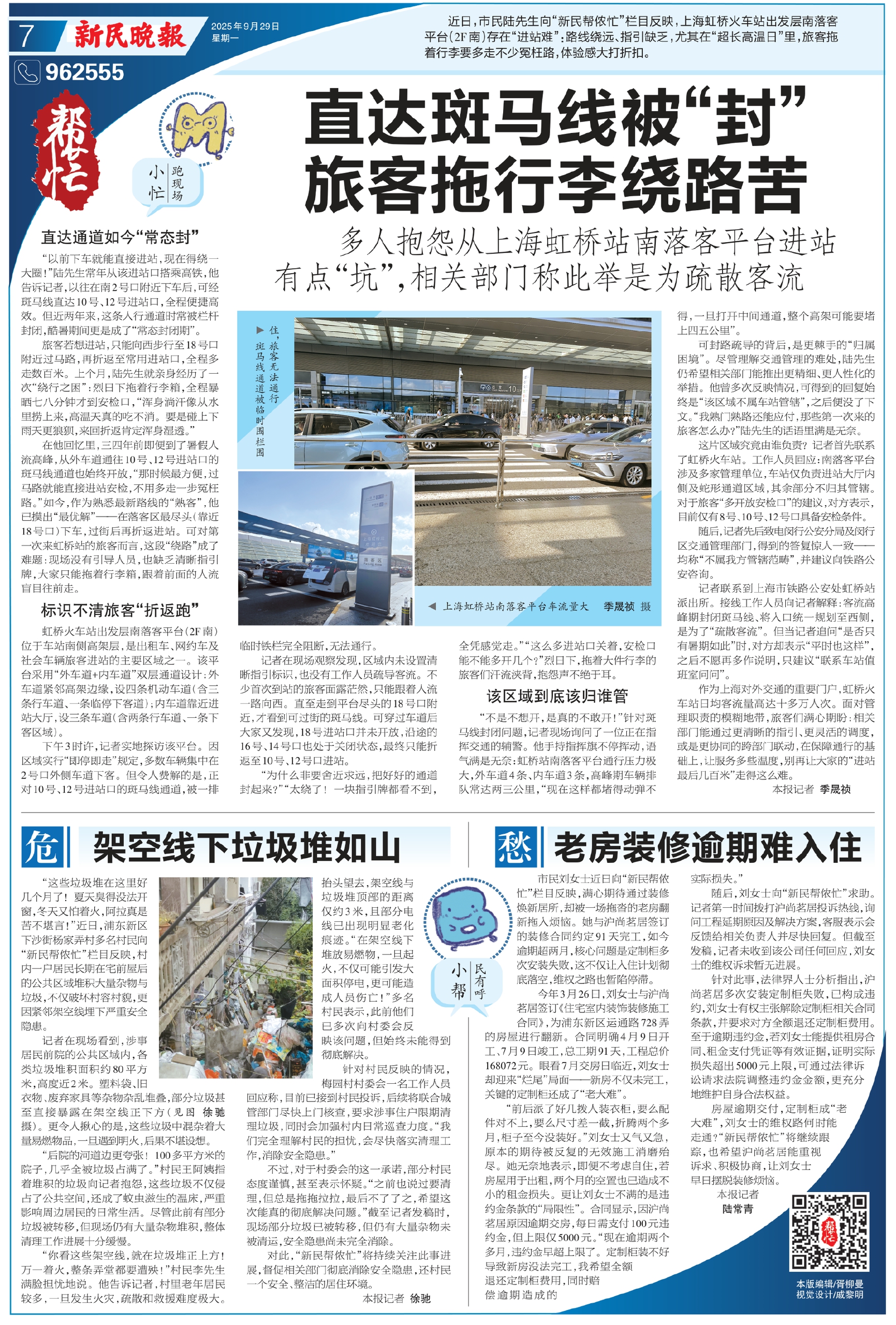 近日,市民陆先生向“新民帮侬忙”栏目反映,上海虹桥火车站出发层南落客平台(2F南)存在“进站难”:路线绕远、指引缺乏,尤其在“超长高温日”里,旅客拖着行李要多走不少冤枉路,体验感大打折扣。