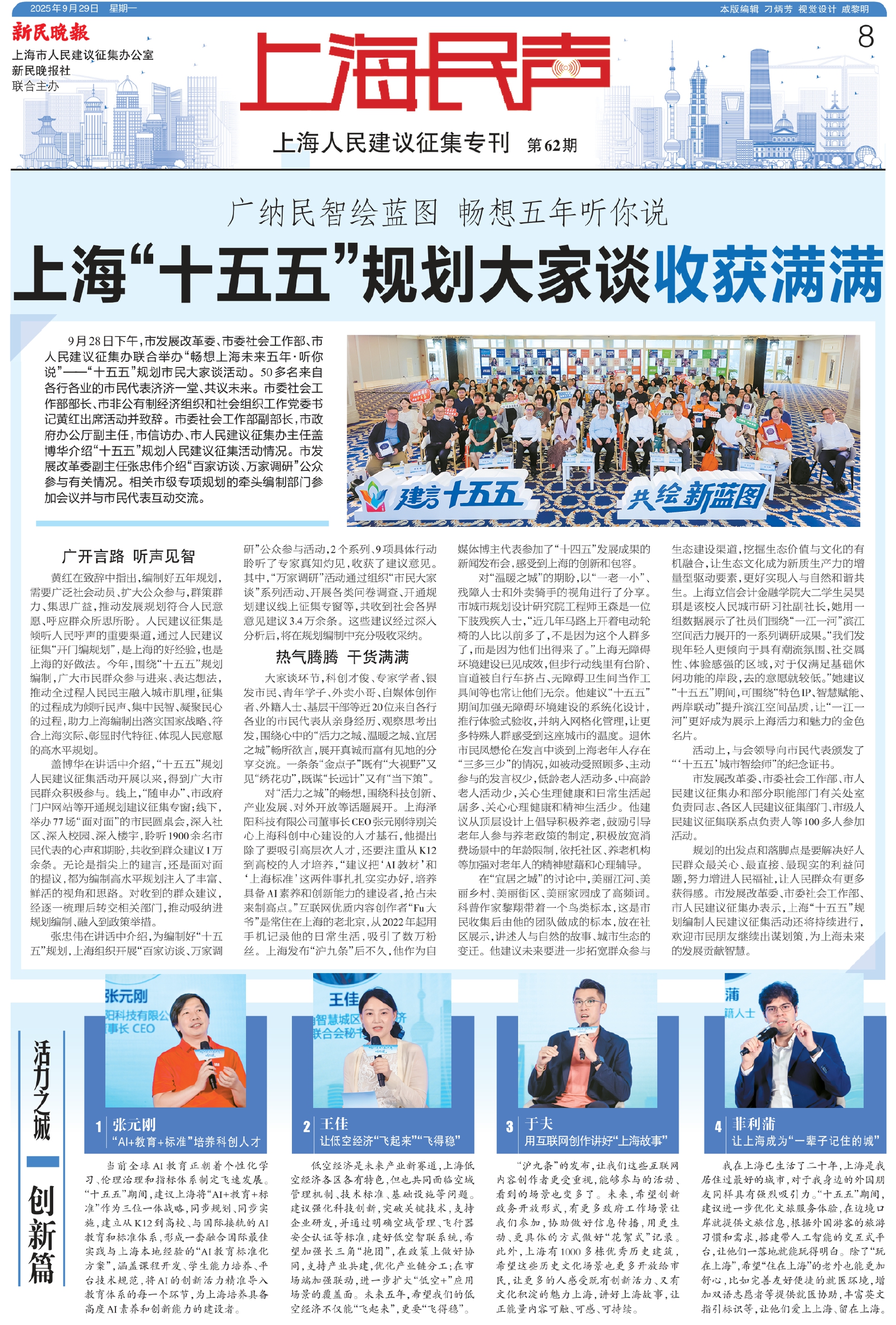 对“活力之城”的畅想,围绕科技创新、产业发展、对外开放等话题展开。上海泽阳科技有限公司董事长CEO张元刚特别关心上海科创中心建设的人才基石,他提出除了要吸引高层次人才,还要注重从K12到高校的人才培养,“建议把‘AI教材’和‘上海标准’这两件事扎扎实实办好,培养具备AI素养和创新能力的建设者,抢占未来制高点。”互联网优质内容创作者“Fu大爷”是常住在上海的老北京,从2022年起用手机记录他的日常生活,吸引了数万粉丝。上海发布“沪九条”后不久,他作为自媒体博主代表参加了“十四五”发展成果的新闻发布会,感受到上海的创新和包容。