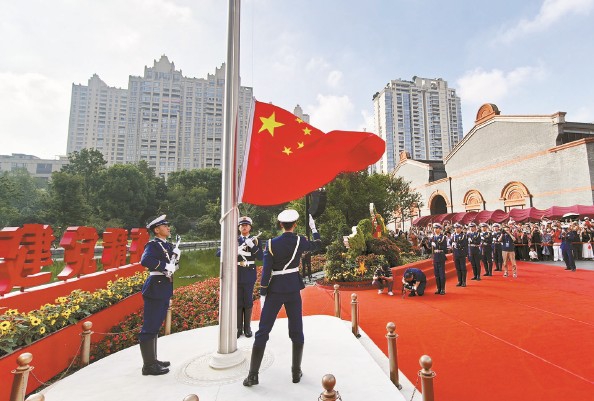 本报讯(记者 陈佳琳)金秋十月,举国欢庆。今晨8时30分,一大广场国旗护卫队步伐铿锵、动作整齐。伴随着《义勇军进行曲》的激昂旋律,鲜艳的五星红旗冉冉升起,全体人员肃立致敬。
