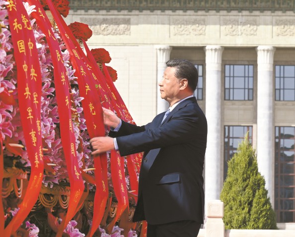 习近平迈步上前,仔细整理花篮缎带。随后,习近平等党和国家领导人缓步绕行,瞻仰人民英雄纪念碑。