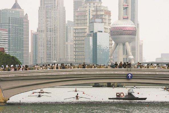 图为运动员们昨天下午在苏州河中试水,为比赛做准备,市民们纷纷在两岸驻足欣赏赛艇高手们的英姿 本报记者 李铭珅 摄