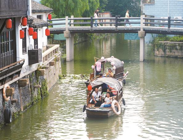 左图为新场古镇不少游客在品美食、逛老街之余还选择乘坐新推出的花船,畅游水系四通八达的后市水巷,一览枕河人家的独特风情 杨建正 摄