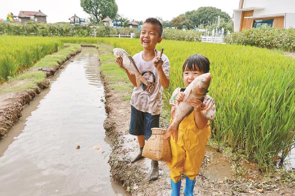 上图为在金山区山阳田园,参加亲子摸鱼比赛的孩子开心地举起自己的收获 特约通讯员 庄毅 摄