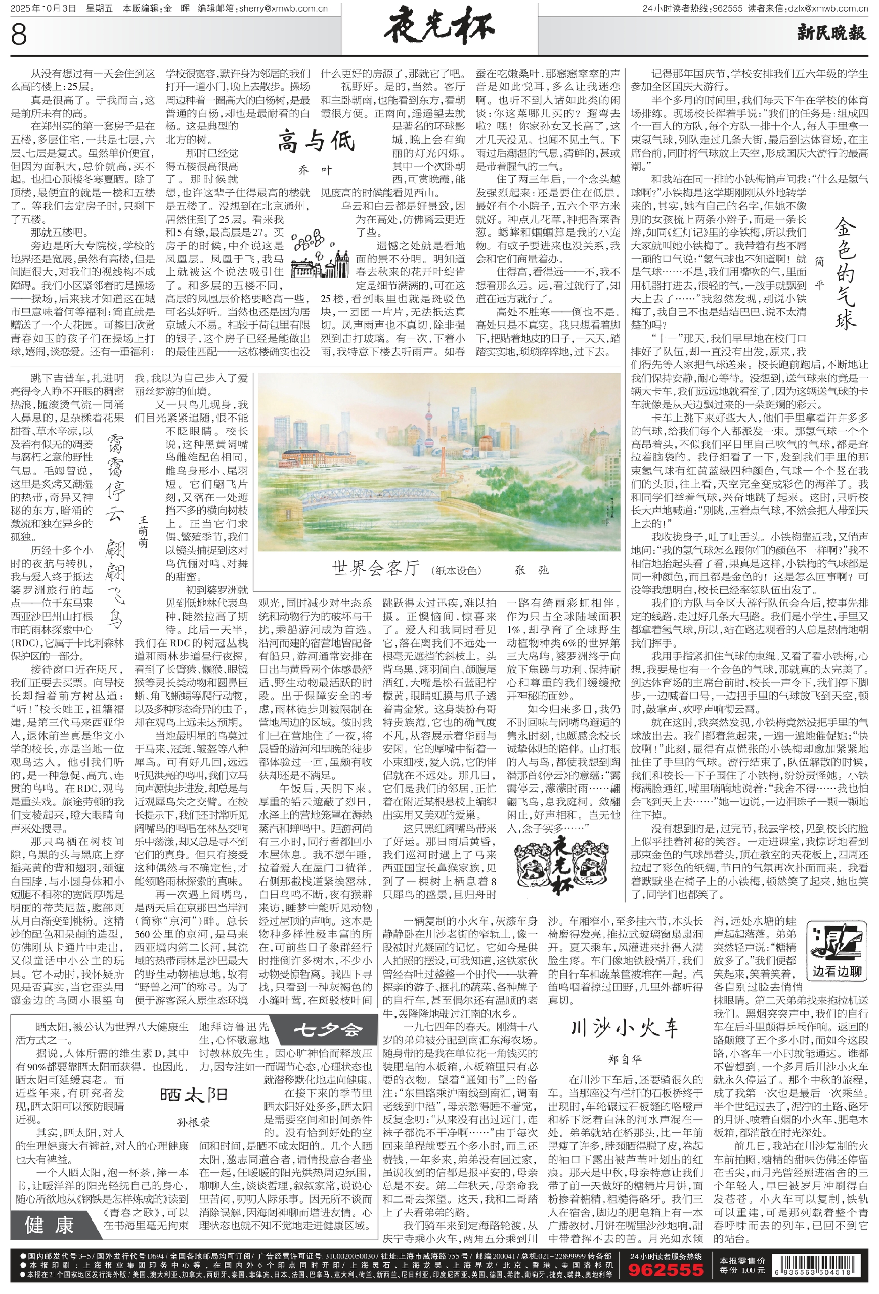 遗憾之处就是看地面的景不分明。明知道春去秋来的花开叶绽肯定是细节满满的,可在这25楼,看到眼里也就是斑驳色块,一团团一片片,无法抵达真切。风声雨声也不真切,除非强烈到击打玻璃。有一次,下着小雨,我特意下楼去听雨声。如春蚕在吃嫩桑叶,那窸窸窣窣的声音是如此悦耳,多么让我迷恋啊。也听不到人诸如此类的闲谈:你这菜哪儿买的?遛弯去啦?嘿!你家孙女又长高了,这才几天没见。也闻不见土气。下雨过后潮湿的气息,清鲜的,甚或是带着腥气的土气。