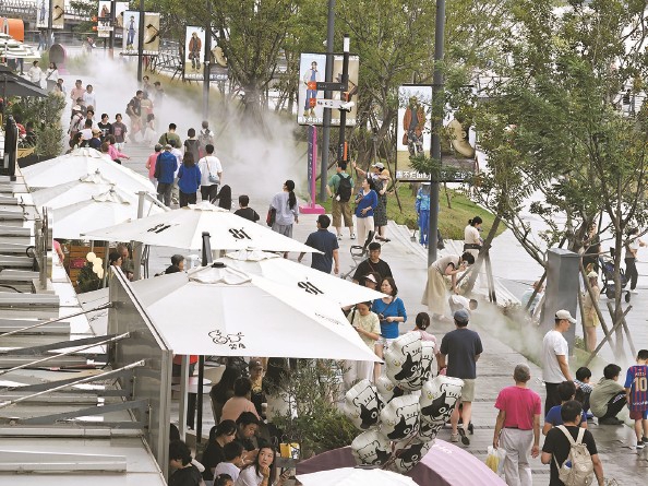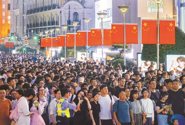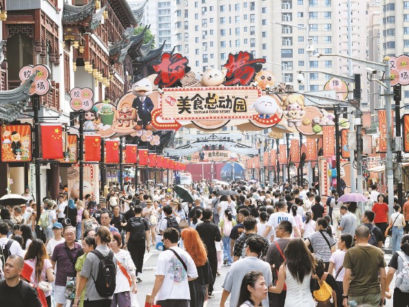 这个“超长黄金周”,申城各大标志性景点和商圈人气满满,夜幕下的南京路步行街游人如织(左图 杨建正摄);在豫园、徐汇滨江,市民逛潮店品美食,享受悠闲时光(右图 本报记者 刘歆 摄)。