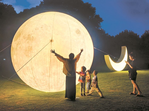■ 明天是中秋佳节,一组联动装置艺术作品《月地徐徐》近日在复兴公园大草坪亮起,将月相时序变化与循环转化为可感知的艺术现场,吸引市民游客前来互动打卡(见左下图)。 杨建正 摄影报道