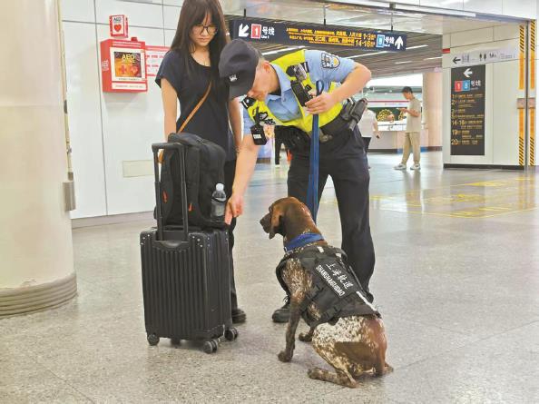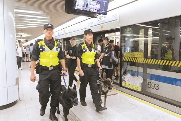 宋王缘(左)和顾晨瀚带着“幺幺”“薯条”去人民广场站执勤 本版图片除署名外均为受访者供图